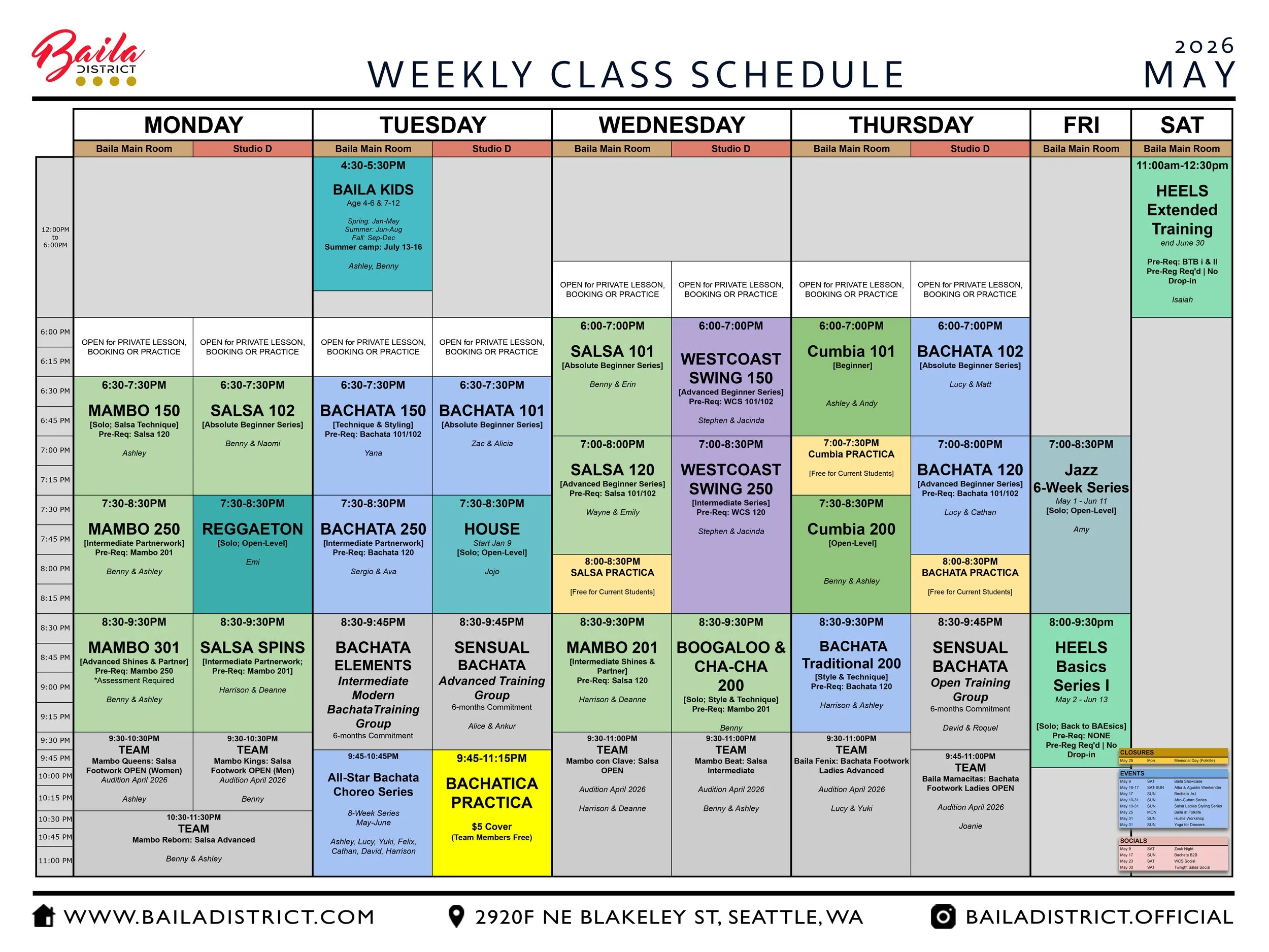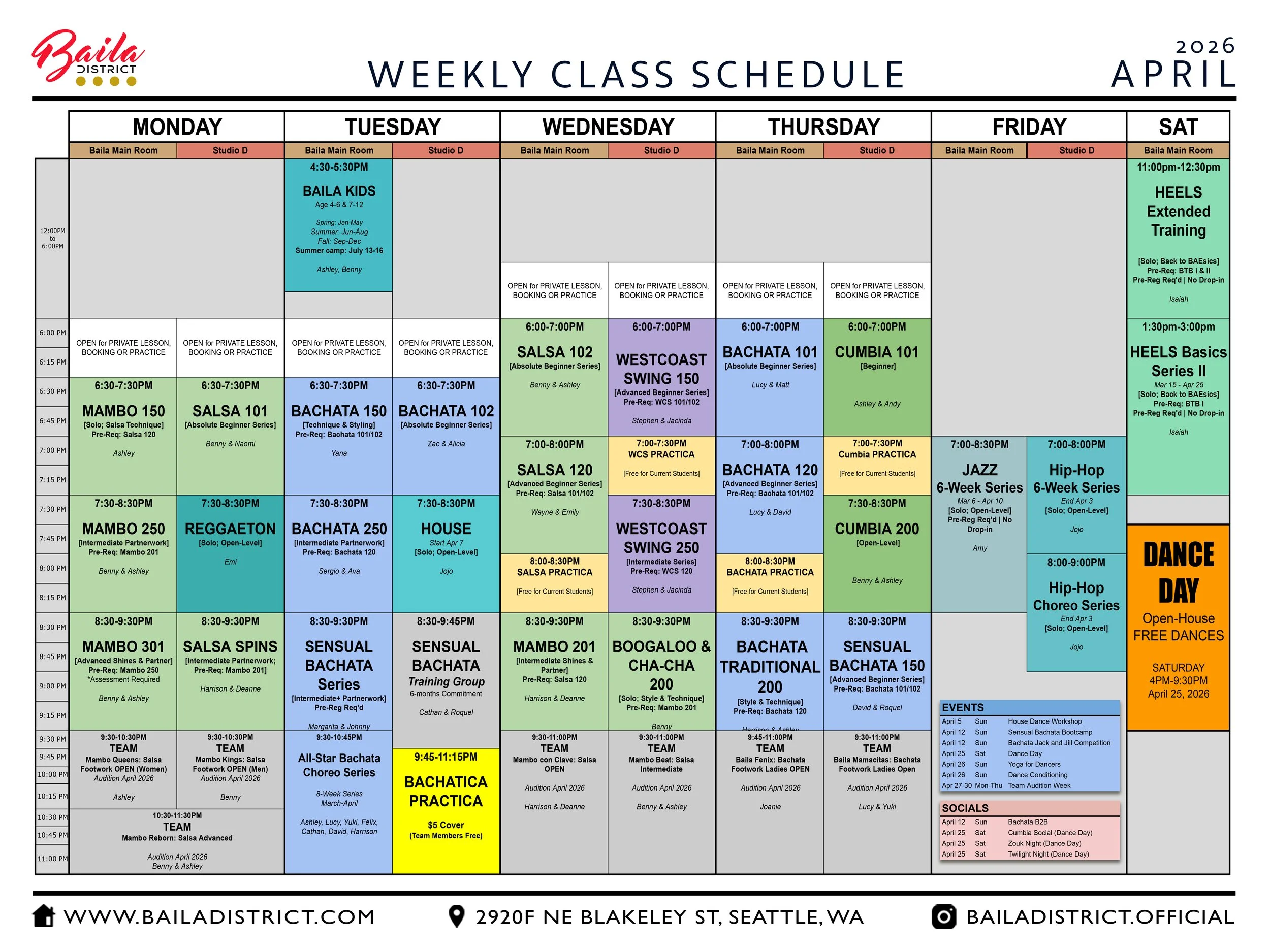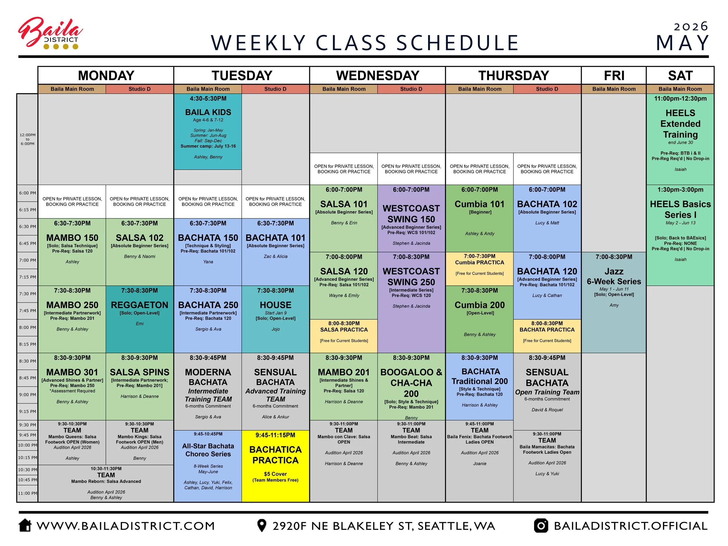 Seattle's best salsa & bachata dance classes for kids and adults. Convienently located next to University Village, discover why Baila District is the best place to take dance classes. Try our beginner package or join a dance team!