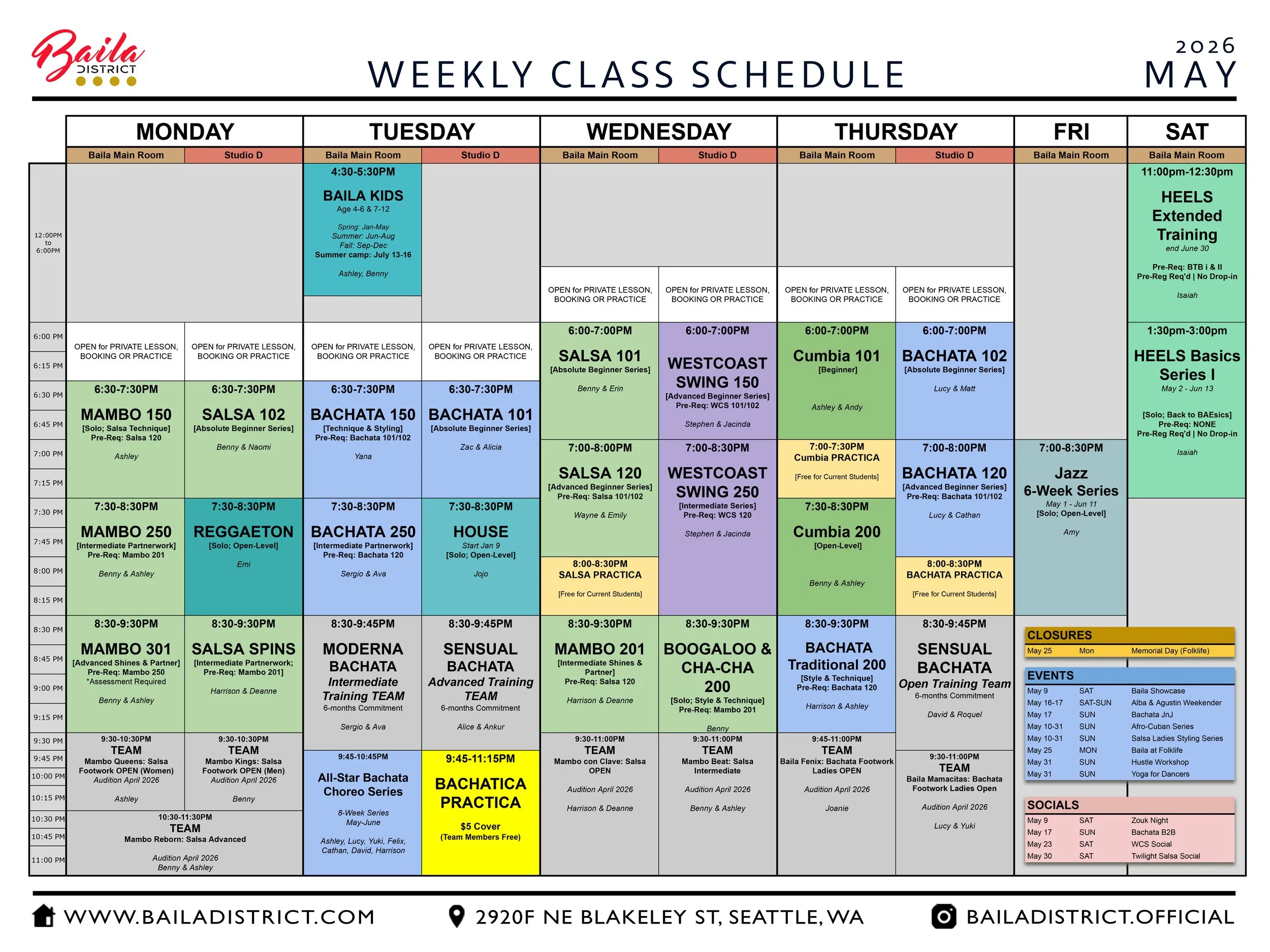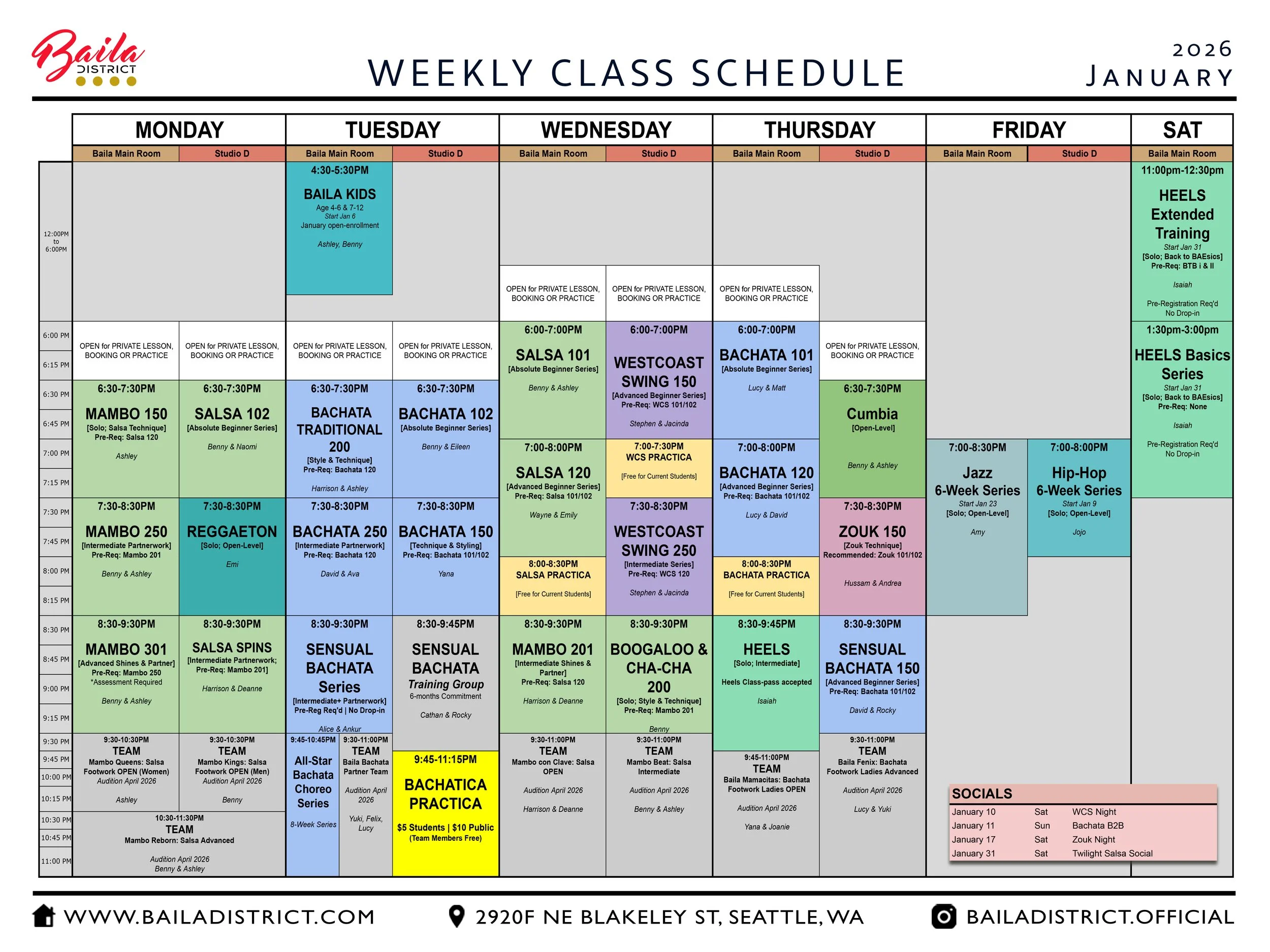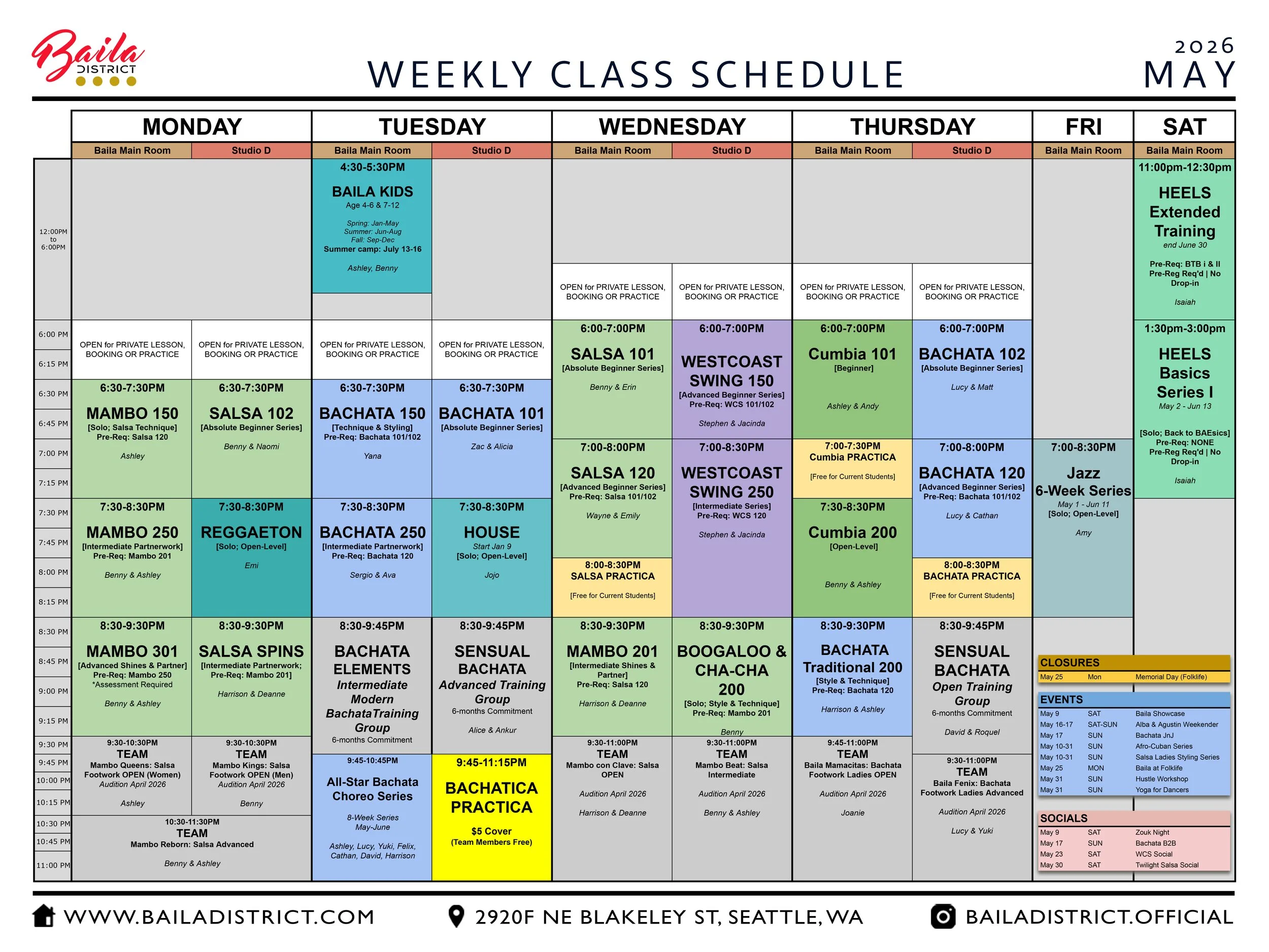 Seattle's best salsa & bachata dance classes for kids and adults. Convienently located next to University Village, discover why Baila District is the best place to take dance classes. Try our beginner package or join a dance team!