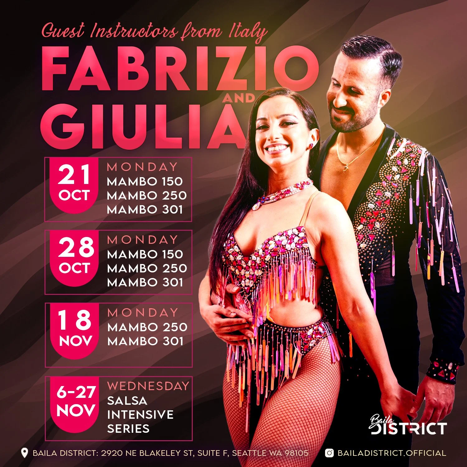Wow! Italian salsa artists Fabrizio & Giulia are in town! They will be teaching several salsa classes for no additional charge. It doesn’t get better than that! Don’t miss out on this special training.