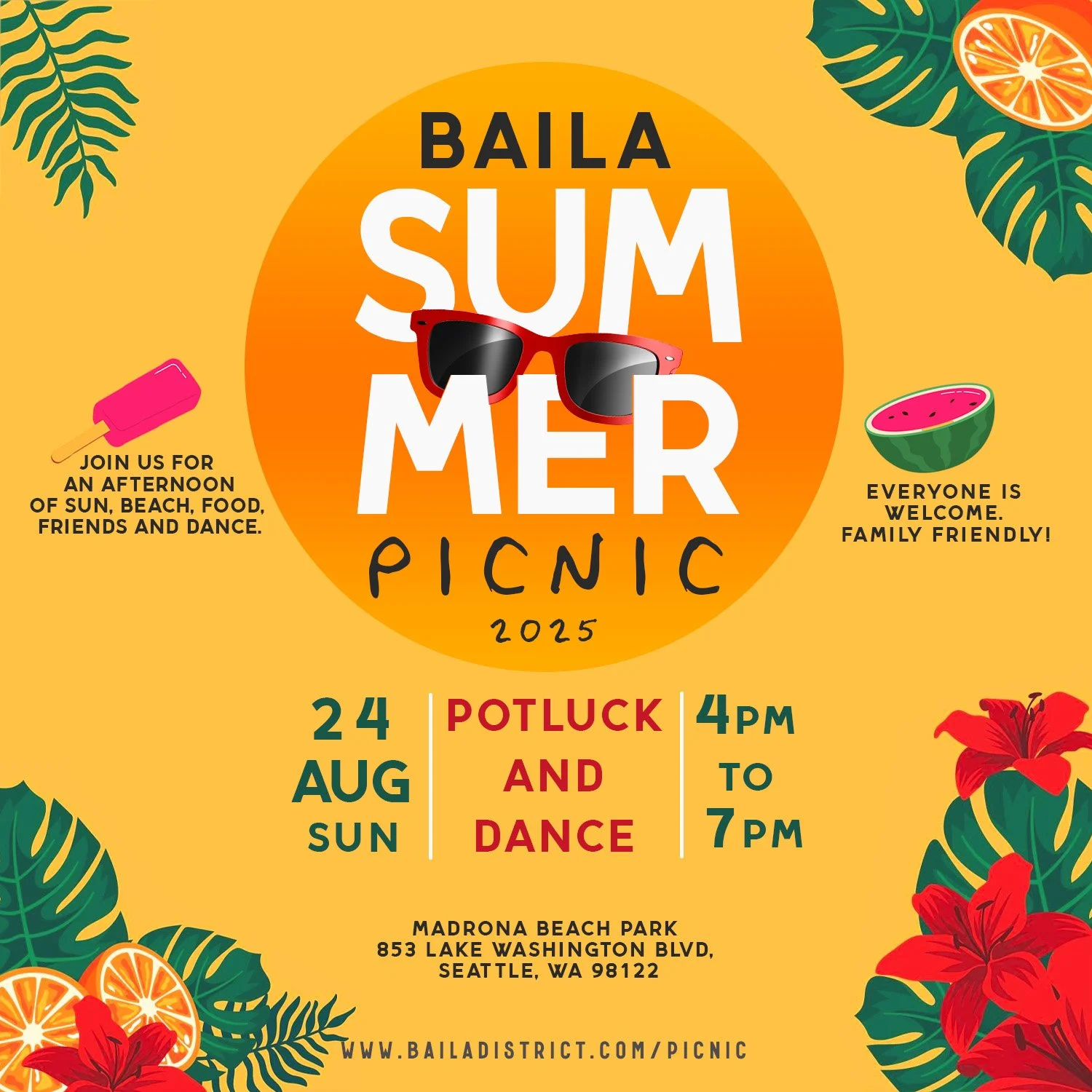 Baila District would like to invite all of our community members to our annual summer picnic. We love to see you outside of the studio at the beach. Join us for this fun family-friendly afternoon of mingling, dancing and food!