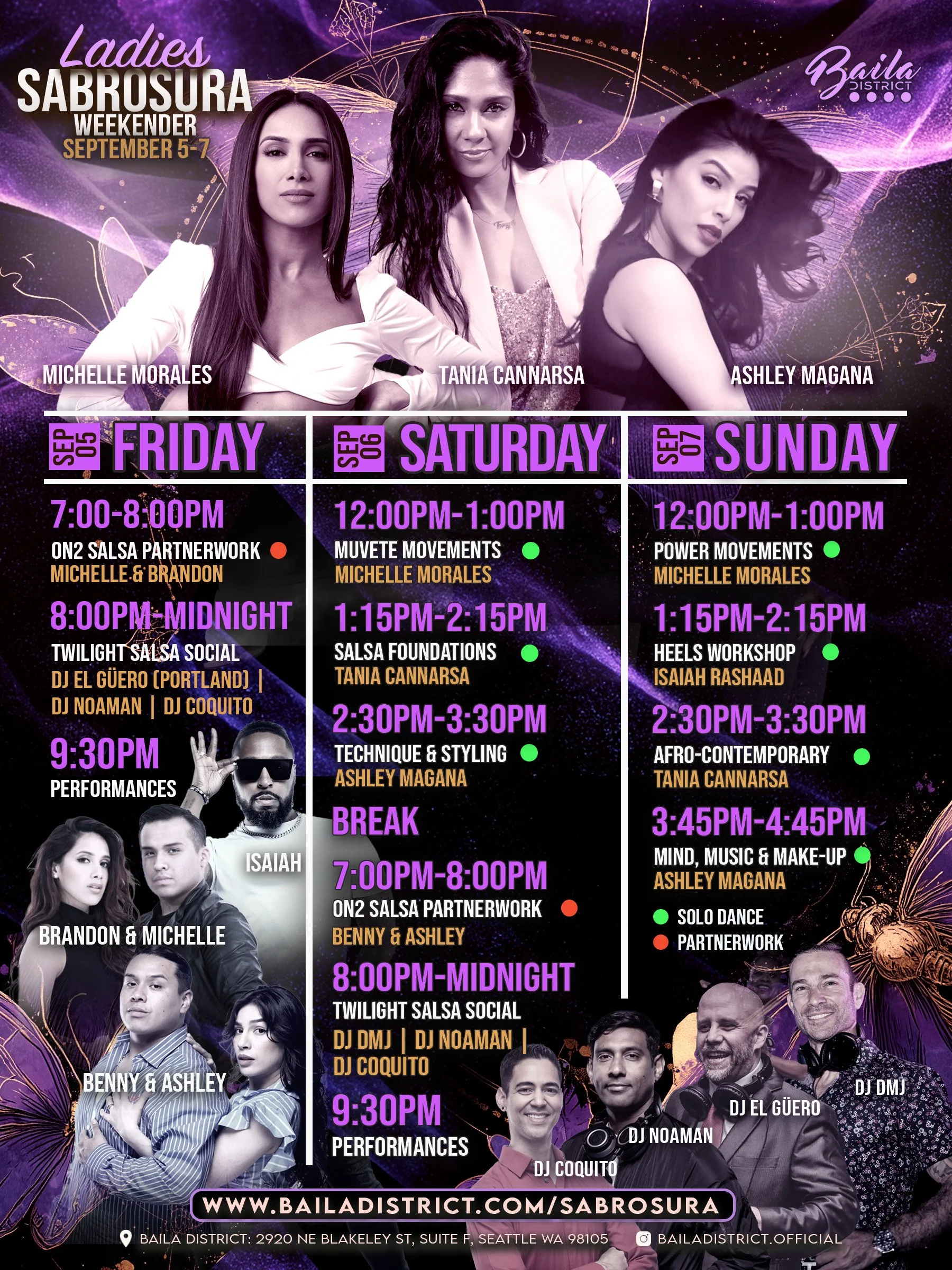 The Sabrosura Ladies Salsa Weekender is a celebration of feminine movement, musicality, and expression. Join us for a weekend of empowerment, artistry, and unapologetic joy, guided by three powerhouse female dancers: Tania Cannarsa, Michelle Morales, and Ashley Magaña.