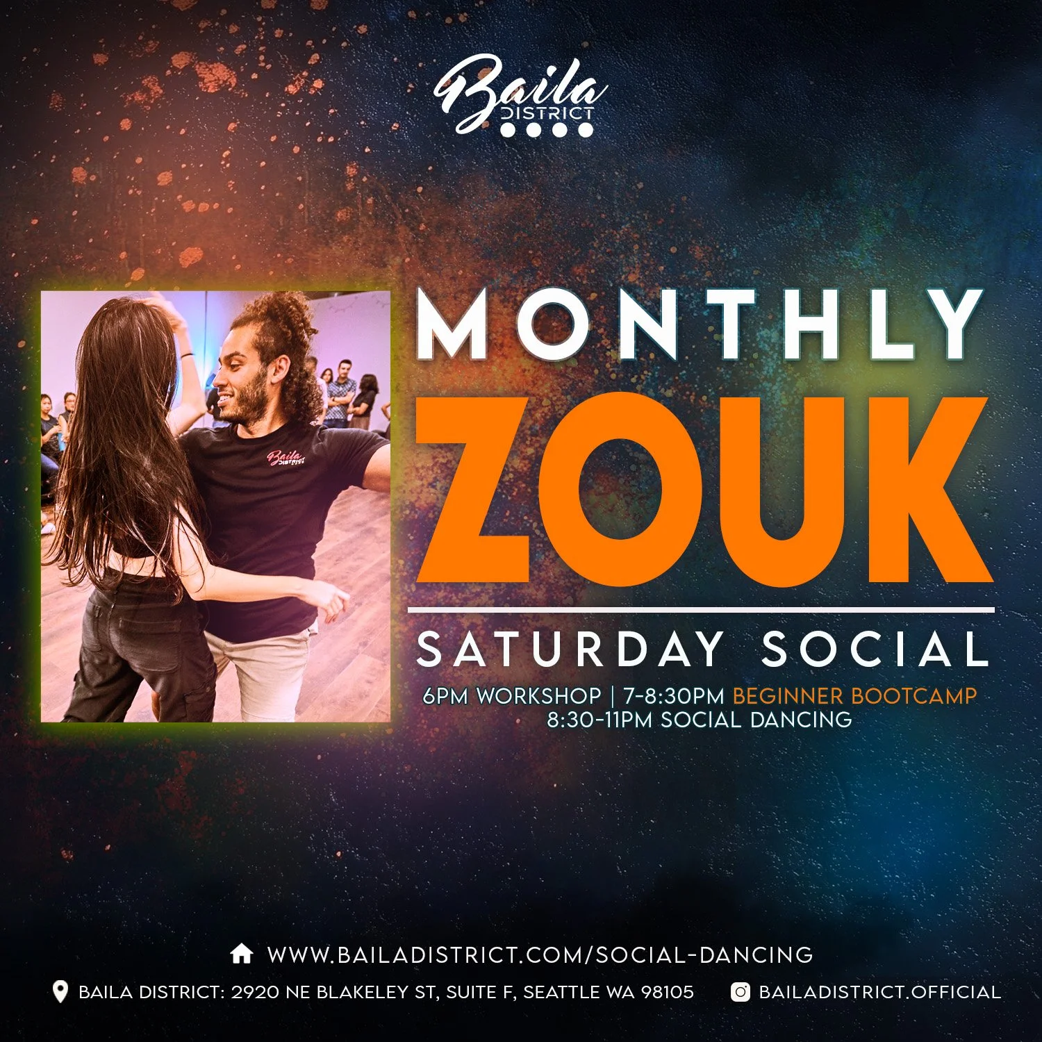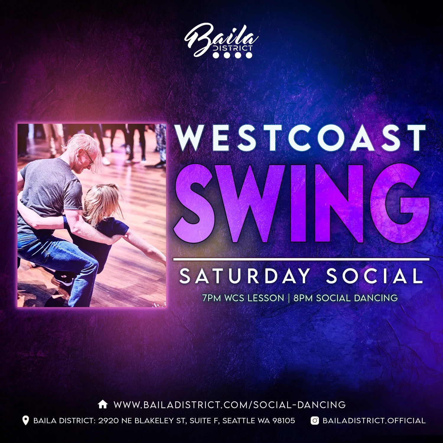 Our weekly social is held at Baila District on Tuesdays 9:45-11:15pm.